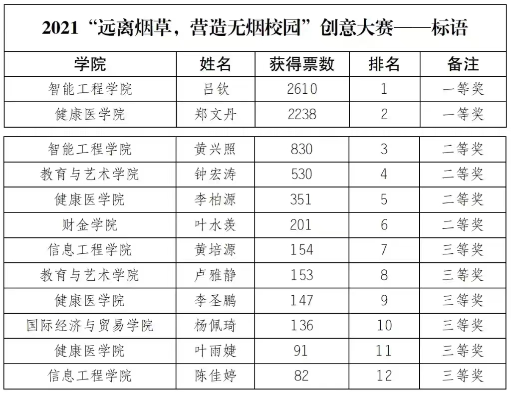 本次活动主题为“远离烟草,营造无烟校园”,财金学院团总支广泛动员师生共同参与,最终财金学院20会计6班叶水羡同学在标语组拿到第六名,荣获二等奖,获得精美奖品无线充电宝一个。通过此次活动,希望财金师生对于吸烟有害健康有更进一步的认识,在校园,拒绝吸烟,从每个人做起。(文/刘潇)