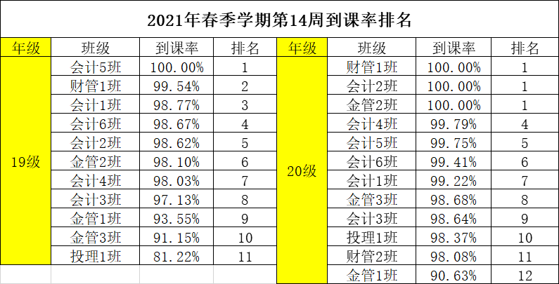 为了有效地提高财金学院学风、班风的建设,团总支纪检部对我院第十四周班级课堂到课率情况进行检查,经过汇总,各班级的到课情况如下:
