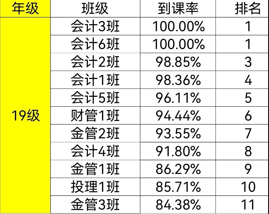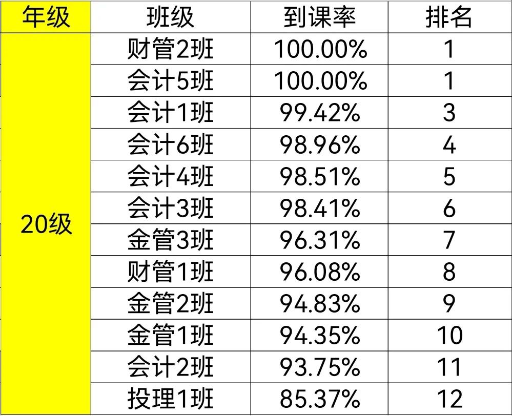 为了有效地提高财金学院学风、班风的建设,团总支纪检部对我院第五周班级课堂到课率情况进行检查,经过汇总,各班级的到课情况如下: