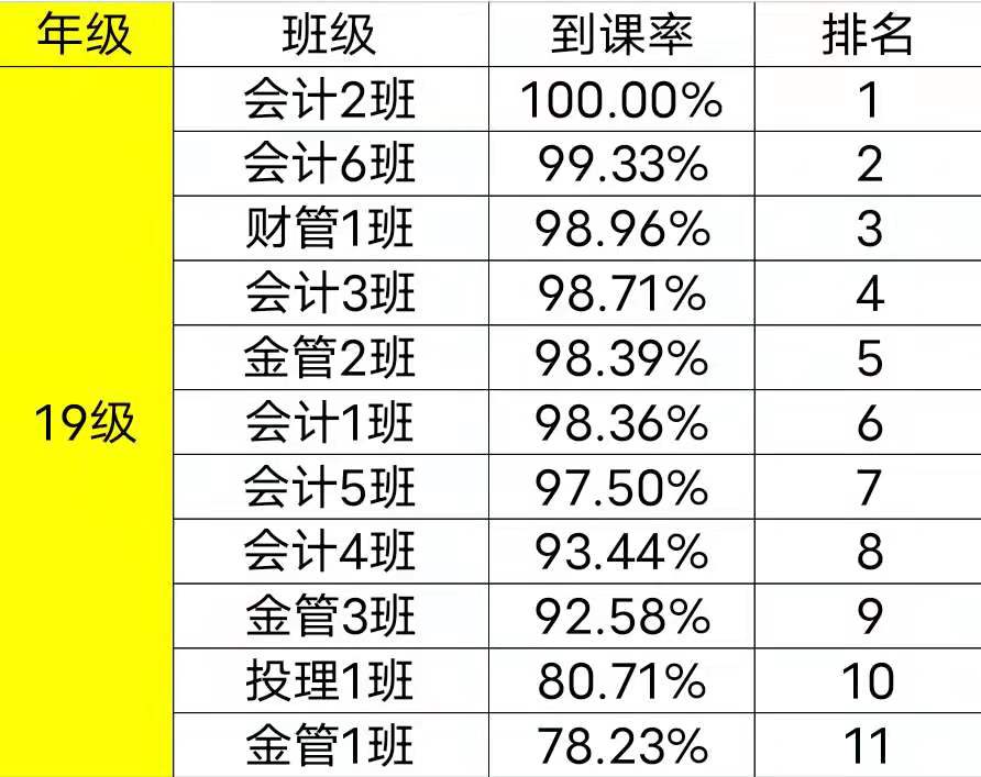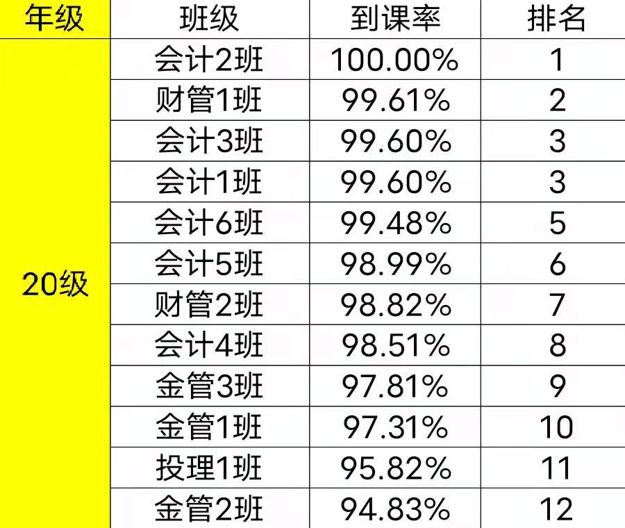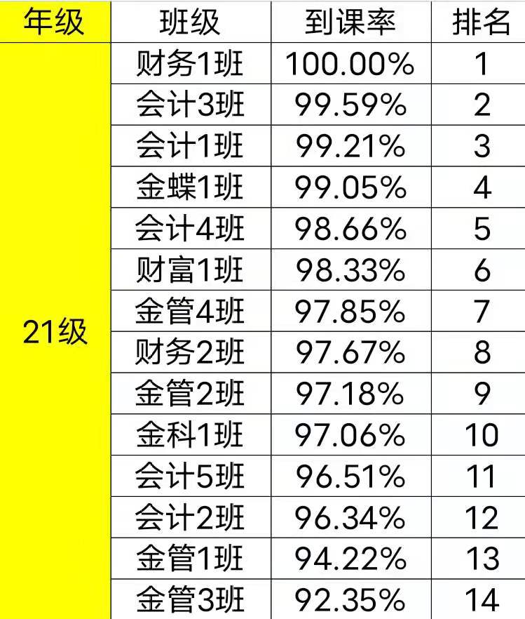 为了有效地提高财金学院学风、班风的建设,团总支纪检部对我院第七周班级课堂到课率情况进行检查,经过汇总,各班级的到课情况如下: