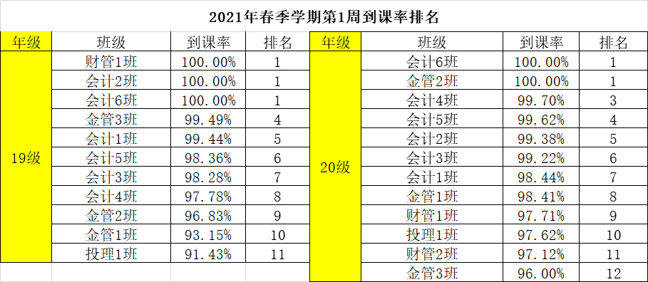为了有效地提高财金学院学风、班风的建设,团总支纪检部对我院第十五周班级课堂到课率情况进行检查,经过汇总,各班级的到课情况如下: