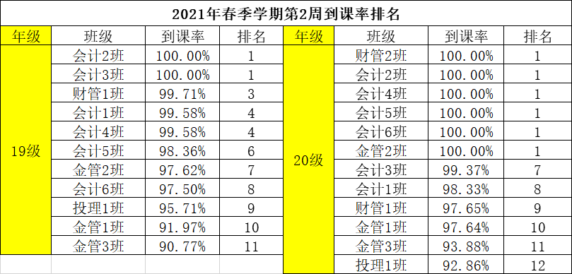 为了有效地提高财金学院学风、班风的建设,团总支纪检部对我院第二周班级课堂到课率情况进行检查,经过汇总,各班级的到课情况如下: