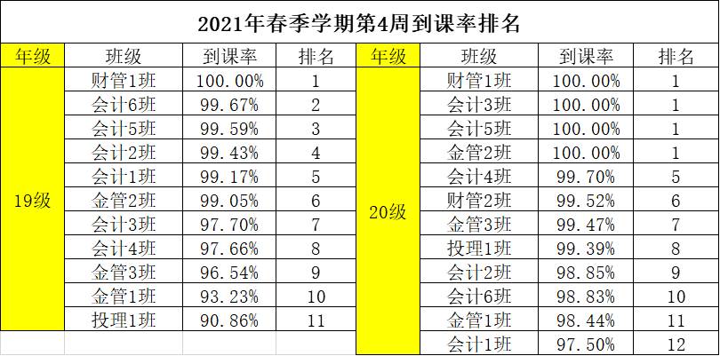 为了有效地提高财金学院学风、班风的建设,团总支纪检部对我院第十五周班级课堂到课率情况进行检查,经过汇总,各班级的到课情况如下: