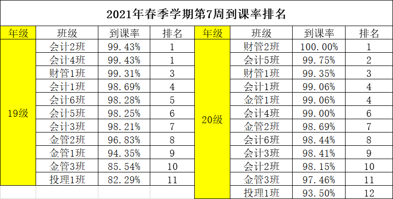 为了有效地提高财金学院学风、班风的建设,团总支纪检部对我院第七周班级课堂到课率情况进行检查,经过汇总,各班级的到课情况如下: