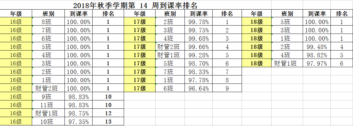 为了有效地提高我系学风、班风建设,团总支办公室对我系第十四周学生课堂到课率进行检查,经过汇总,各班级的检查结果如下: