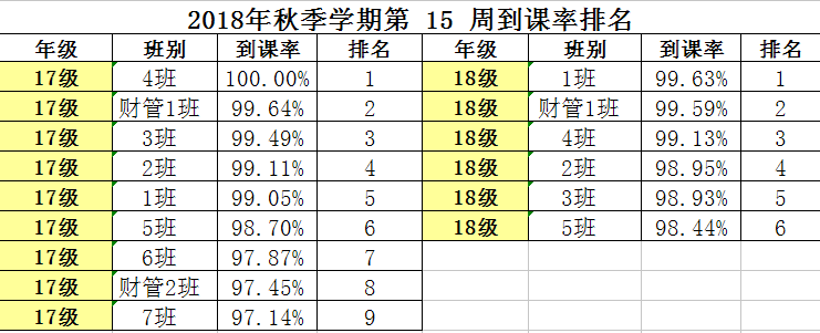 为了有效地提高我系学风、班风建设,团总支办公室对我系第十五周学生课堂到课率进行检查,经过汇总,各班级的检查结果如下: