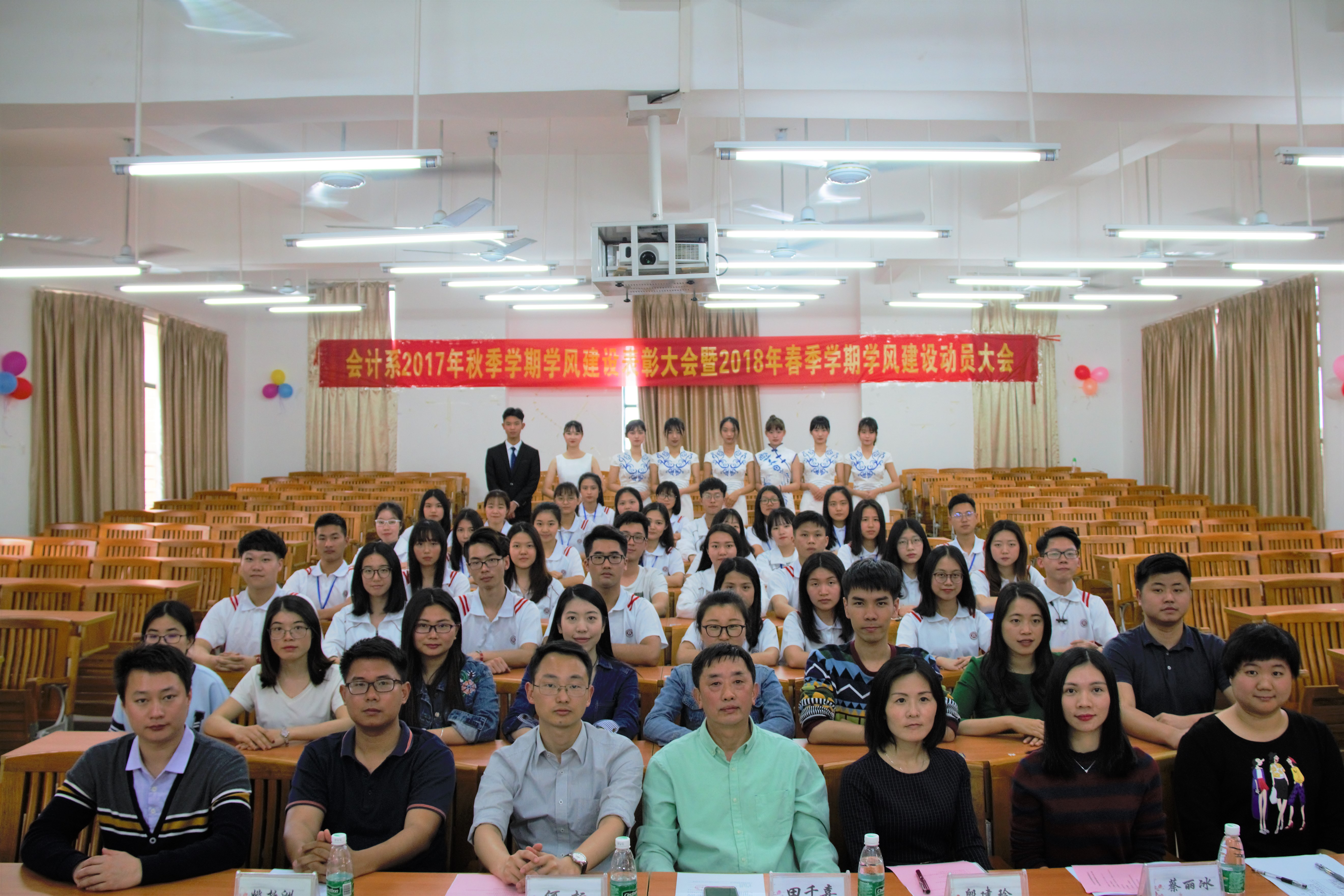 为了弘扬会计系的优良学风,更好营造学风良好氛围,我系于2018年03月27日下午16:20在博学楼C301举行会计系2017年秋季学风建设表彰大会暨2018年春季学期学风建设动员大会。出席此次会议的领导有会计系田千喜主任、会计系殷建玲副主任、学工副主任何标老师、系团总支姚柏洲书记、教工党支部书记蔡丽冰书记以及会计系老师和获奖学生代表。