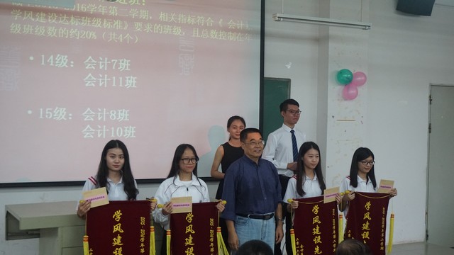 随后,学风建设学习标兵代表曾凯燕同学发言,分享自身的学习方法,强调良好的学习氛围对学习的重要性。接着,学风建设先进班代表利明霖同学发言,从思想、学习、生活三个方面介绍了如何加强班级的凝聚力。而后,詹业宏等领导分别为获全勤奖、学习标兵、标兵宿舍长、标兵宿舍和先进班获奖代表颁发荣誉证书和锦旗。最后,詹业宏副院长为本次会议总结讲话,赞扬了我系全体教师教书育人的工作态度和芊芊学子的积极配合与刻苦精神,并要求教育管理者进行严格管理,让学生在历练中学习,在学习中成长,在成长中成熟,在成熟中成功,创造会计系更美好的明天。
