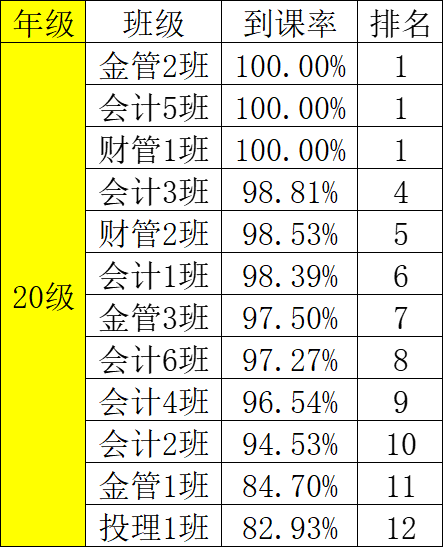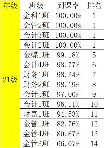为了有效地提高财金学院学风、班风的建设,团总支纪检部对我院第十六周班级课堂到课率情况进行检查,经过汇总,各班级的到课情况如下:
