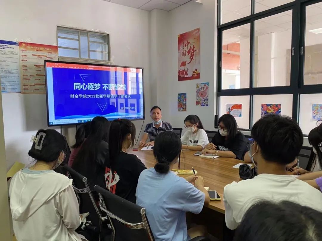 2022年8月31日上午,财金学院团总支于博学楼A509顺利召开了新学期第一次团学干部会议,参加本次会议的师生有团委副书记郑傲然老师,团学指导老师曾斌以及团学干部。