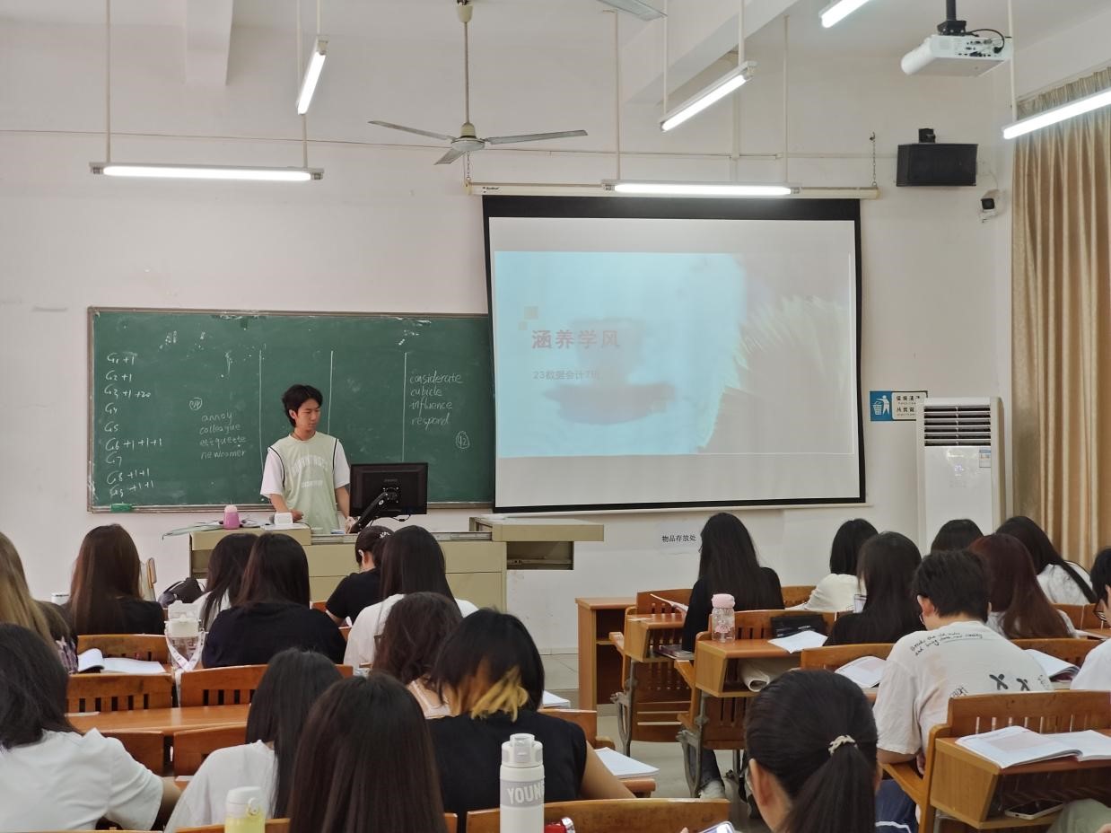 4月17日,广州华商职业学院23级数据会计7班在博学楼成功举行了一场主题为“涵养学风”的班会。此次活动由班级纪委范宏林与学委郑宝宜共同策划,旨在促进学生端正学习态度、加强纪律意识、改进学习方法,并提升学术成绩与综合素养。