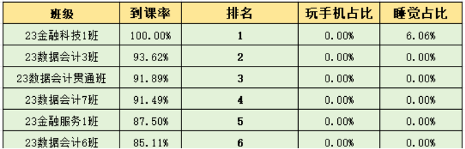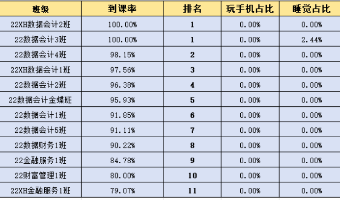 注:以上为一周的平均值,查课中途离开教室的人数会影响平均值!22金科1班,23数据会计1班,23数据会计2班,23数据会计金蝶班,23数据会计4班,23数据会计5班23数据财务1班本周未查到暂无数据.