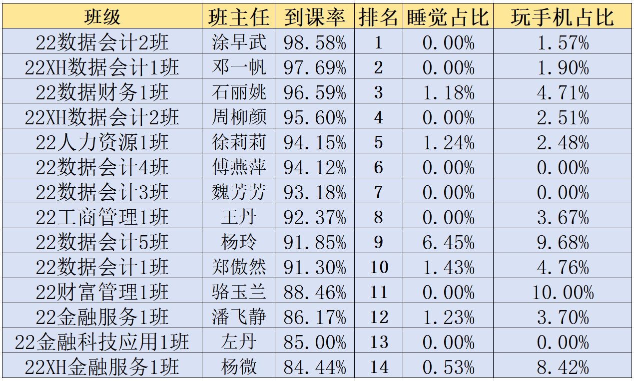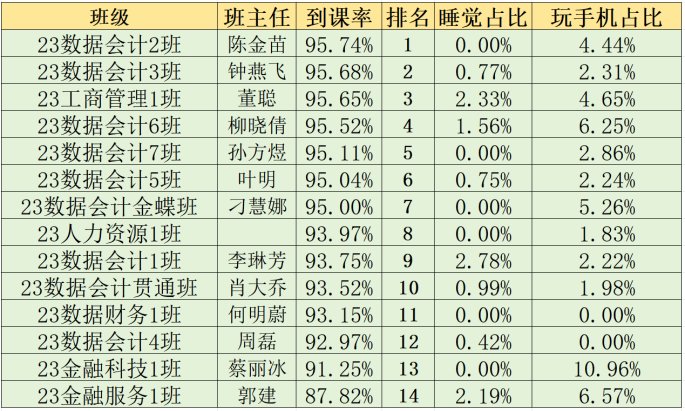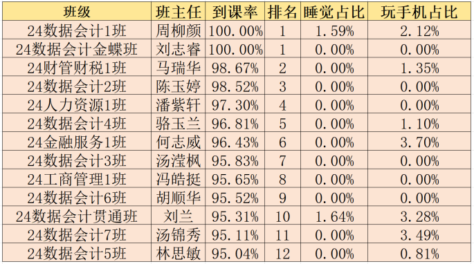 为有效提高数字财经学院学风、班风建设,学生会纪检部对我院第十二周班级课堂到课率进行检查,经过汇总,各班级到课情况如下: