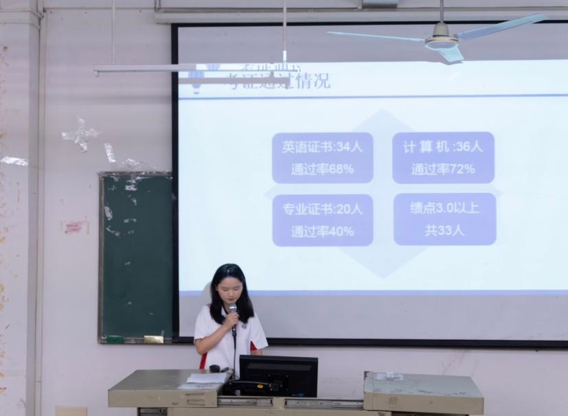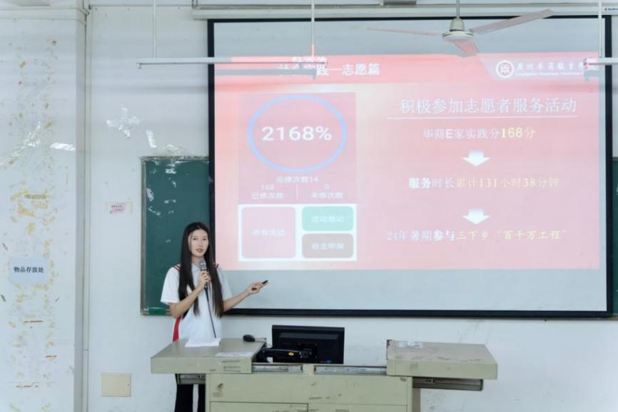 22XH数据会计2班林娟淑同学向我们分享他们班级座右铭“奋斗是青春最亮丽的底色!”从思想政治情况、学业成果、课外实践活动等多个维度展示班级成果。并指出要构建一个正面且充满活力的班级环境,依赖于每个学生的主动投入、遵循纪律以及持续的自我进步。