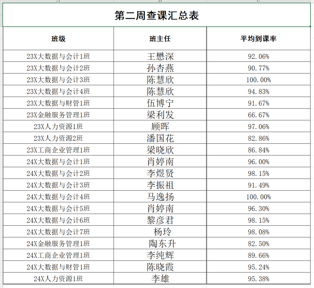 数字财经学院上周查课汇总表新鲜出炉丨江门校区 2025年3月11日 数字财经学院查课汇总 江门校区 前 言 学风建设绝非一朝一夕之功,而是一项需要长期坚持的系统工程。良好的学风犹如春风化雨,滋润着每一位学子的成长。它不仅关乎个人学业成就,更影响着整个校园的学术氛围与发展前景。让我们携手共进,积极投身学风建设,共创优良学习环境 。 第二周查课报告 为全面了解数字财经学院教学状况,保障教学质量稳步提升,学院组织了全面且细致的查课工作。此次查课旨在精准掌握大家的学习状态和课堂情况。现将查课结果汇总呈现,以便共同审视、改进提升 。以下便是数字财经学院23级和24级的查课汇总: 结语 亲爱的同学们,学风建设是我们共同的责任与使命!良好学风能为大家铺就成功之路,在浓厚的学习氛围里,知识汲取更高效,梦想也会加速照进现实。 每一次专注课堂、每一回认真作业,都是在为学风建设添砖加瓦。积极参与讨论、主动分享见解,用行动带动身边人。让我们从自身做起,以饱满热情投入其中,一起打造充满活力与希望的优良学风! —END— 照片:纪检部 编辑:龙春锋 初审:陈慧欣 肖婷南 复审:周冰娜 终审:顾晖