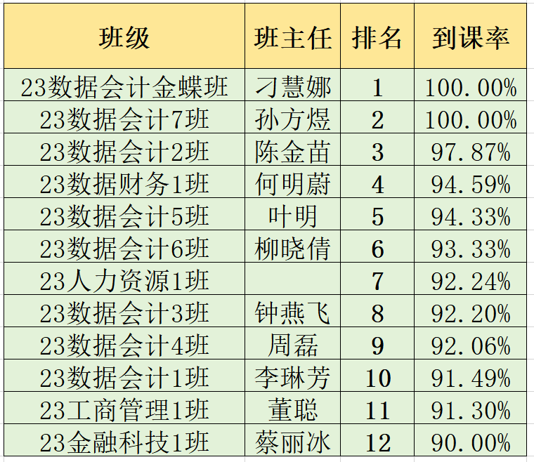 为有效提高数字财经学院学风、班风建设,学生会纪检部对我院第六周班级课堂到课率进行检查,经过汇总,各班级到课情况如下: