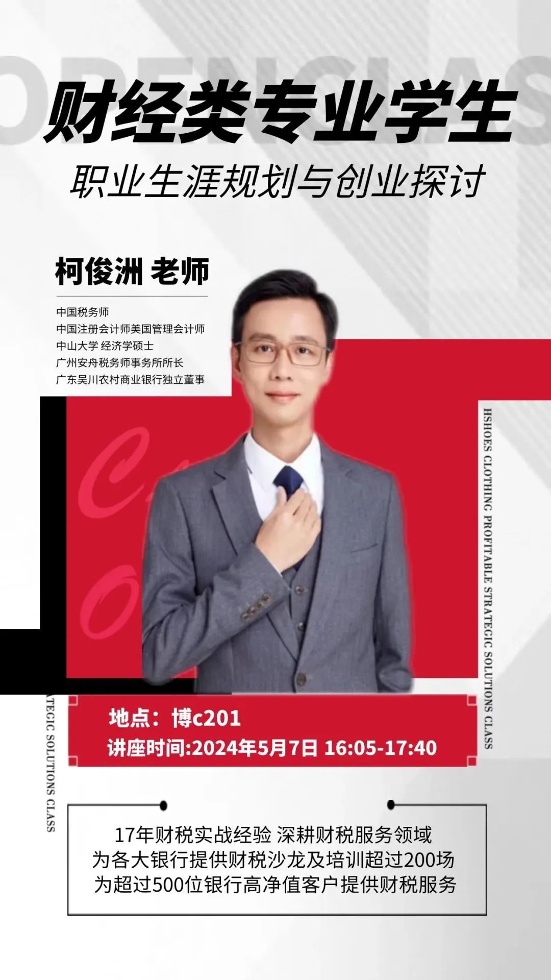 为帮助同学们更好地了解会计学、金融学等专业知识,提升同学们对财经行业的理解,更好地规划未来的职业生涯,财金学院邀请中国税务师柯俊洲老师,在博学楼C201教室开展“关于财经类专业职业生涯规划与创业探讨”讲座。