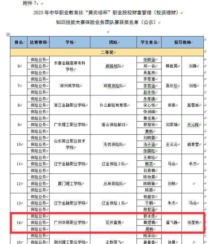11月15日下午2点到4点,“黄炎培杯”职业院校财富管理保险业务大赛如期举行,在学院领导的大力支持下,由潘飞静和汤滢枫老师指导下,来自财金学院22级金融服务与管理1班的郭冰柔,黄煜楠,周桐三位学生历经一个半月的集中训练。本次线上比赛分为知识理论和实践操作2个环节,历时2个小时。最后以团体741.43分荣获全国第二名。