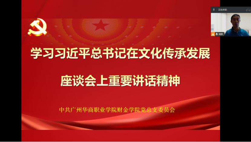 中共中央总书记、国家主席、中央军委主席习近平6月2日在北京出席文化传承发展座谈会并发表重要讲话。他强调,在新的起点上继续推动文化繁荣、建设文化强国、建设中华民族现代文明,是我们在新时代新的文化使命。要坚定文化自信、担当使命、奋发有为,共同努力创造属于我们这个时代的新文化,建设中华民族现代文明。2023年8月17日,财金学院党总支以线上方式组织学习贯彻习近平总书记在文化传承发展座谈会上重要讲话精神,财金学院党总支书记顾晖主持会议。