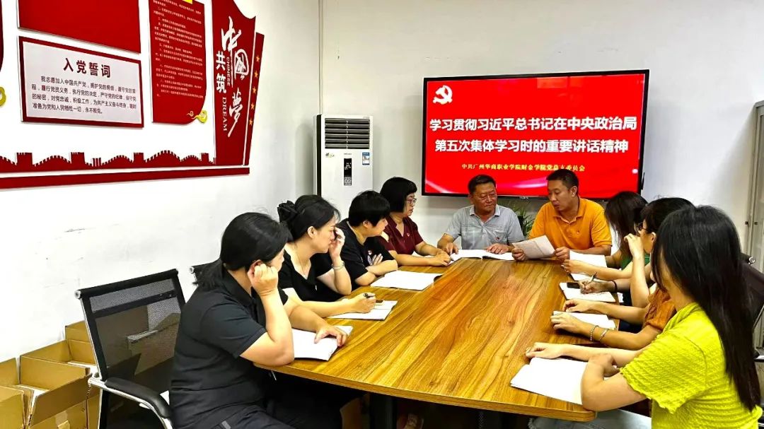 2023年7月6日上午10时在博学楼A509财金学院会议室,在财金学院党总支顾晖书记的主持下,党总支委员们共同深入学习贯彻习近平总书记在中共中央政治局第五次集体学习时的重要讲话精神。
