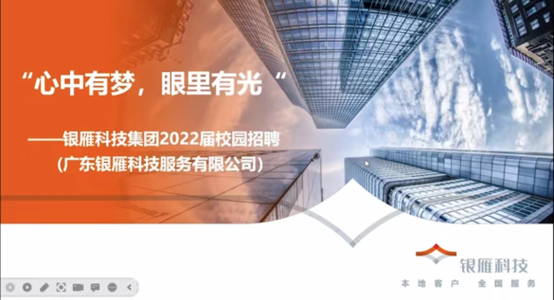 银雁科技的宣讲人陈经理介绍了公司的简介、发展趋势、就业前景及招聘要求等,并且为线上应届毕业生提供了一系列建议。而后,陈经理对业务内容、晋升路径、员工福利等进行了介绍,并与毕业生互动了解他们的就业心态和就业意向,帮助毕业生走好职业生涯的第一步。