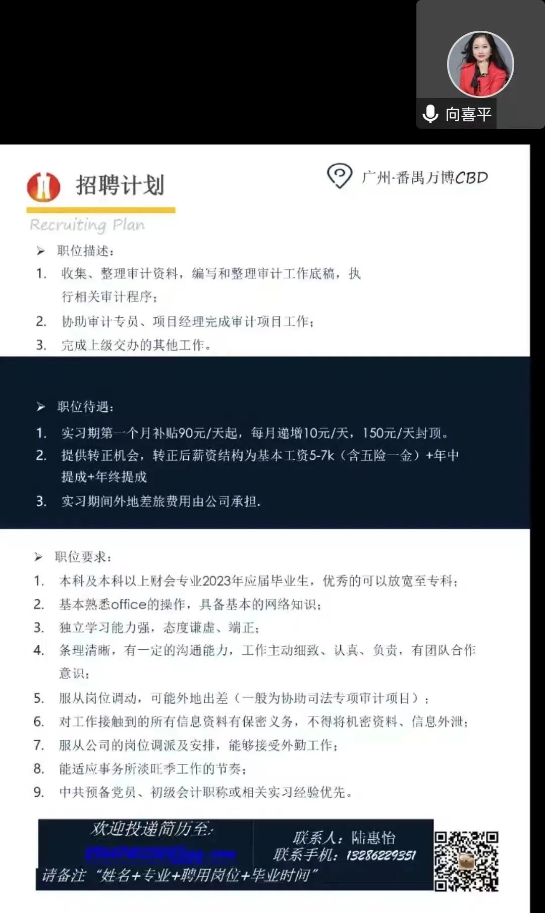 大会伊始,华业向阳(广东)会计师事务所(普通合伙)负责人马总向大家介绍该公司的特色和职责,让大家初步性地了解该公司。接着为毕业生讲述了一些案件经验、工作成果、财务报表审计、工程竣工决算审计等;马总还向大家展示了税务筹划与咨询的一系列表格,该公司针对客户的不同需求制定专门的套餐,让客户拥有更好的选择。同时还向我们展示了该公司的主要合作伙伴和主要客户,介绍了办公环境与团建活动。让大家知道该事务所不只是局限于一项服务,而是全方位、多方面的服务。最后马总讲述了招聘计划以及岗位职责,让毕业生明确自己的职业方面,拥有更多选择岗位的机会。
