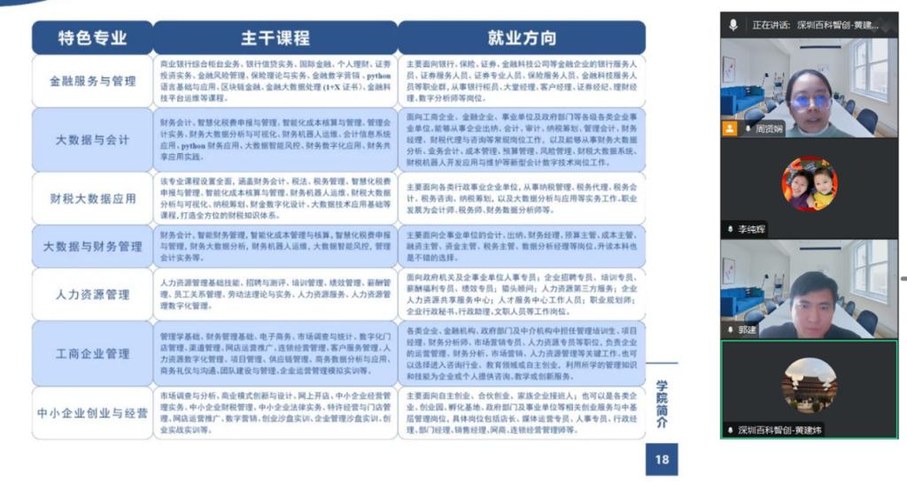 2025年2月25日下午3点,数字财经学院李纯辉副院长、郭建老师和周贤娴老师与深圳市百科智创科技有限公司黄建炜总经理进行了视频会议,双方就校企合作事宜进行了深入交流,并达成初步合作意向。