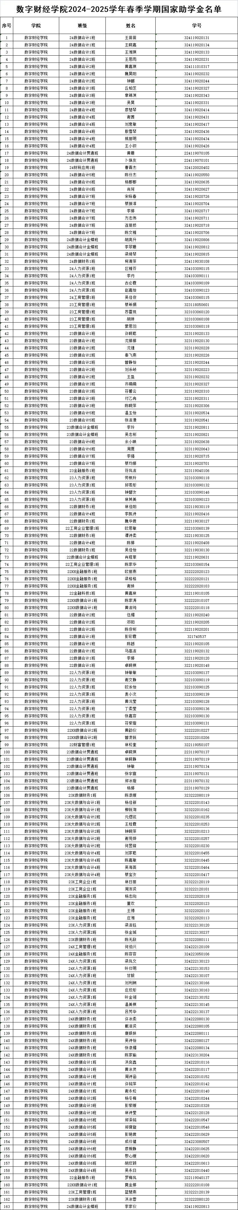 根据《关于2024-2025学年春季学期国家助学金评审的通知》要求,结合全国学生资助管理信息系统中困难生认定结果,经学生本人申请、辅导员审核、学院评审工作小组初审等程序,拟推荐163名学生获得2024-2025学年春季学期国家助学金,现对名单予以公示,具体名单如下: