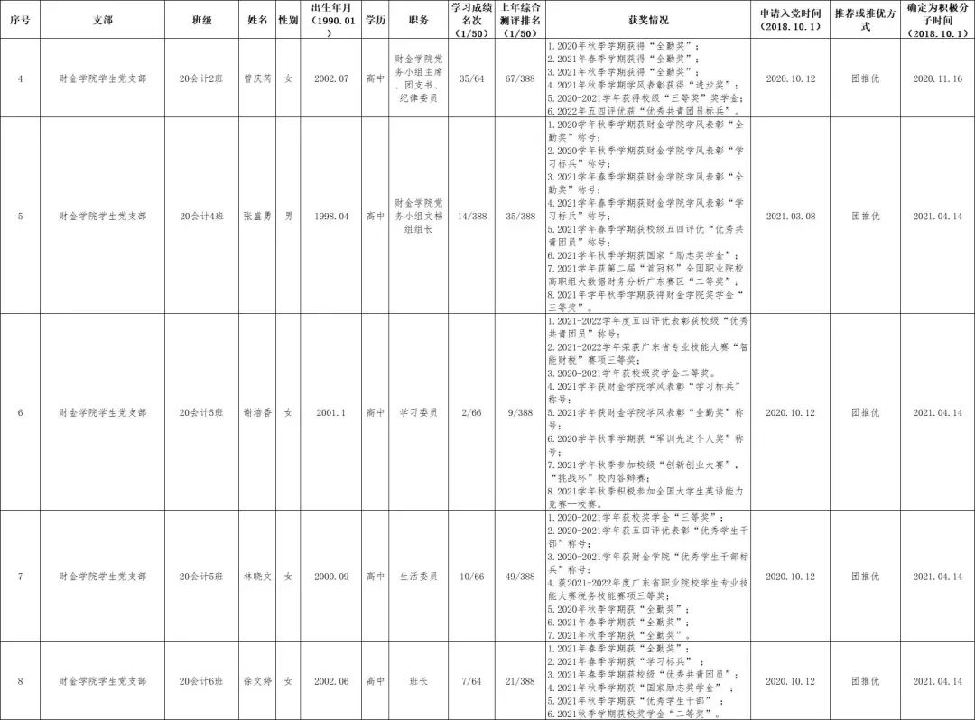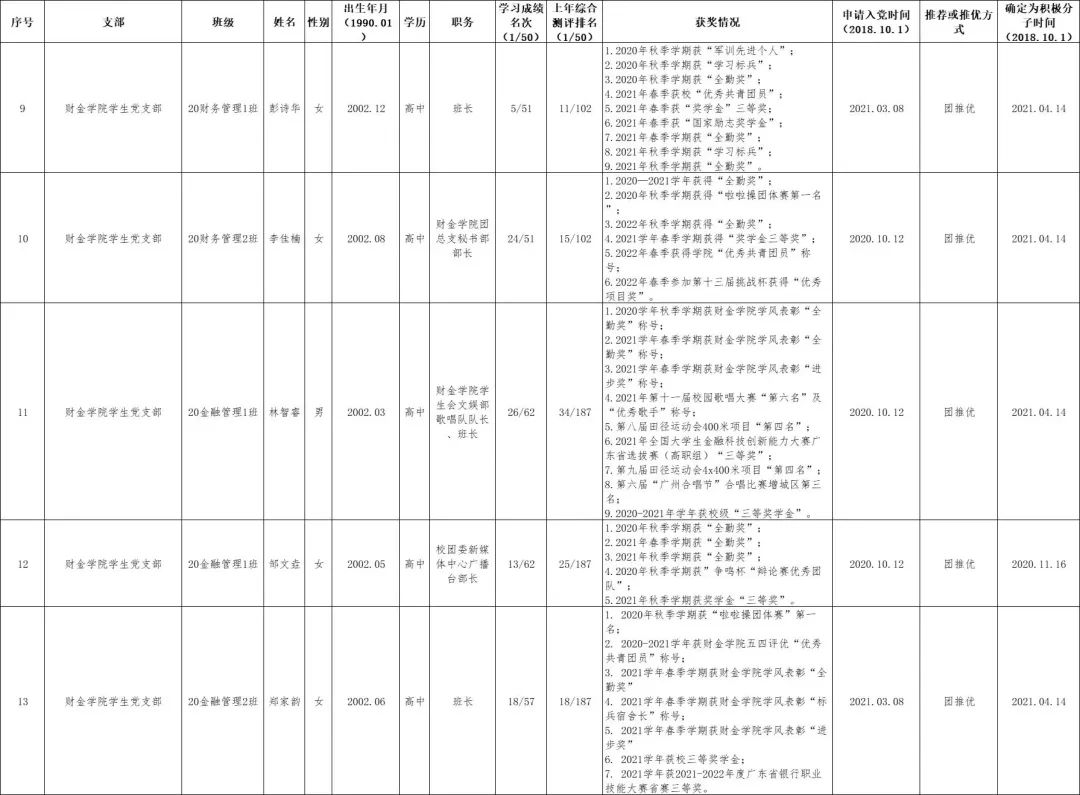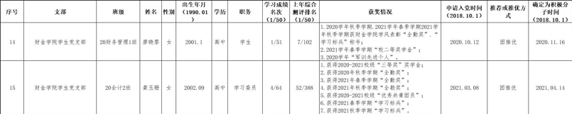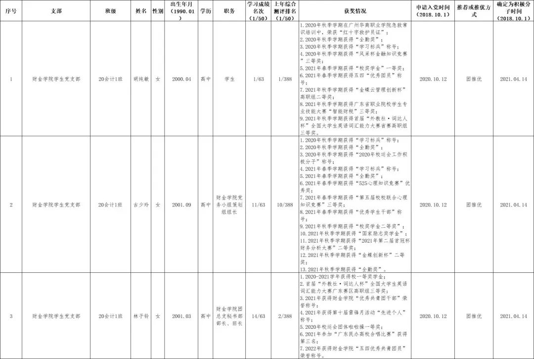 为进一步增强发展党员工作的透明度,加强民主监督,确保新发展党员的质量,根据上级有关要求,现将财金学院学生党支部本次发展对象名单公示如下: