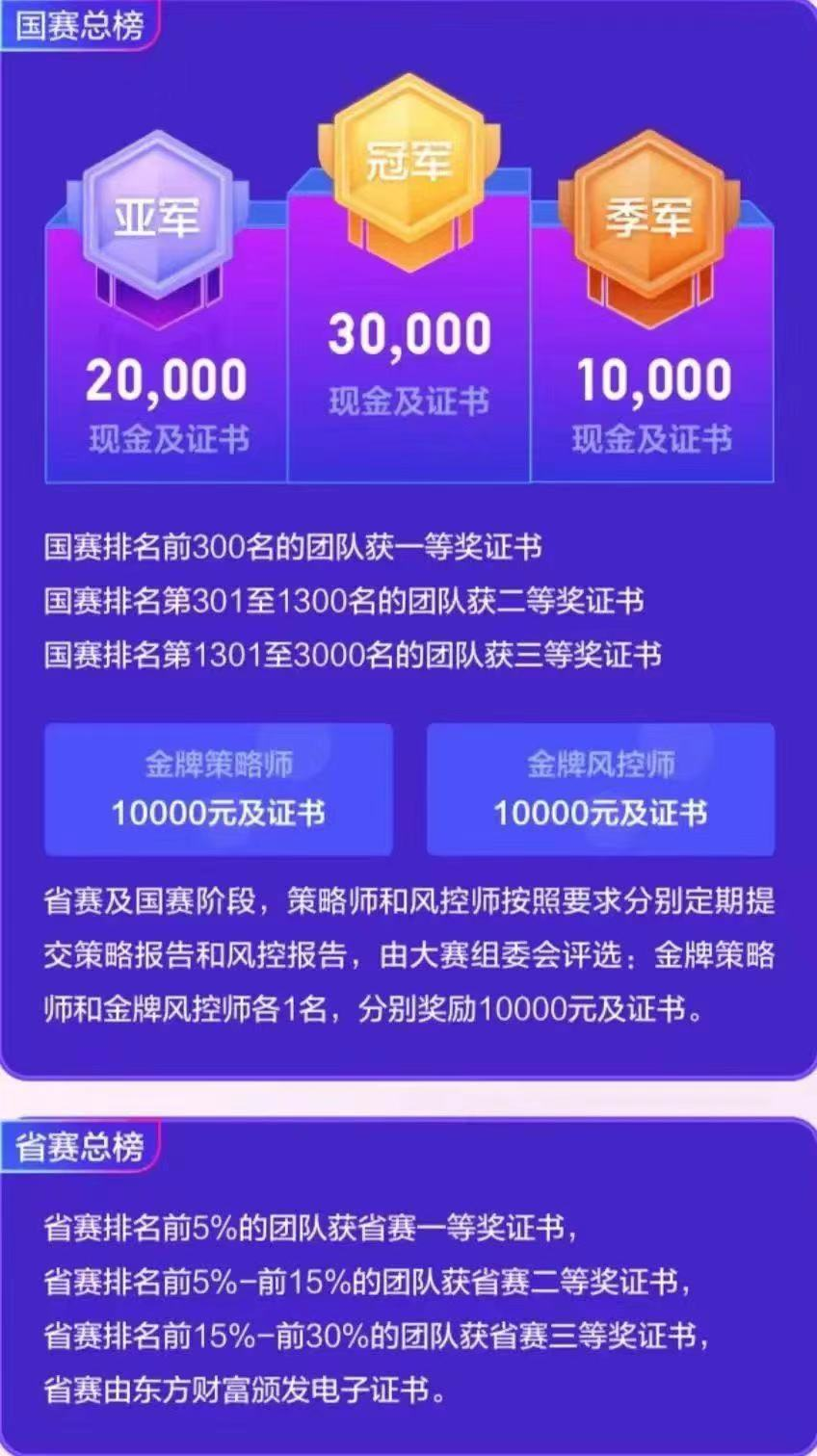 校赛:学生以个人名义参赛,进行模拟交易。各校综合收益率排名前30%的学生进入省赛。