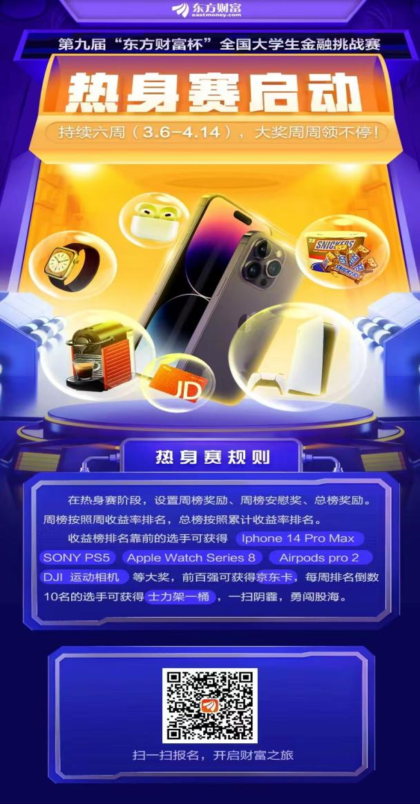 目前为热身赛(个人赛):2023年3月6日——2023年4月14日(周期6周,4月15日前,参赛同学可以在系统中进行热身练习,以熟悉交易规则和操作系统,收益率不计入正式赛成绩。)竞赛奖励丰厚,大家赶快报名,先人一步掌握财富密码吧~