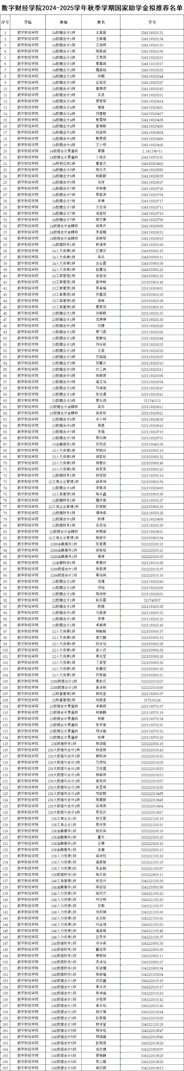 根据《关于2024-2025学年秋季学期国家助学金评审的通知》要求,结合全国学生资助管理信息系统中2024-2025学年秋季学期困难生认定结果,经学生本人申请、辅导员审核、学院评审工作小组初审等程序,拟推荐167名学生获得2024-2025学年秋季学期国家助学金,现对名单予以公示,具体名单如下: