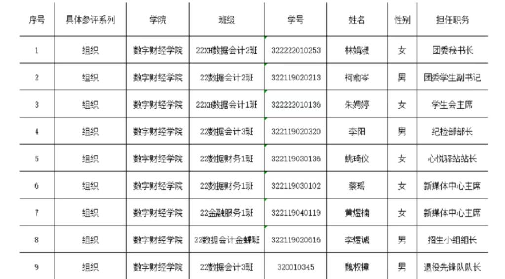 为肯定学生干部的学习和工作成绩、表彰先进、树立典型,激励广大学生干部勤奋学习、提高综合素质,更好地为学校的建设和发展服务,根据华职学〔2024〕32号《关于2023-2024学年优秀学生干部评选的通知》文件内容,我院本着“公开、公正、公平、择优”的原则,经学生自主申请,辅导员评议和学院评审小组审核,我院决定拟推荐林娟淑等9名学生为2023-2024学年校级优秀学生干部(组织系列),具体公示名单如下: 公示期内对评选结果有异议者请以电话或书面形式向数字财经学院反映。 联系人:郑傲然老师 联系电话:020-26227216 办公室:博学楼A509 公示时间:2024年12月3日-12月5日