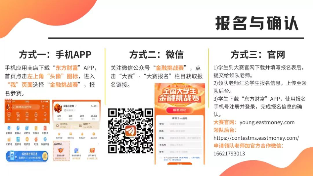 每个参赛学校设一名领队老师,由领队老师负责组织收集参赛学生填写的报名表。1)学生到大赛官网下载并填写报名表后,提交给领队老师。2)领队老师汇总学生报名信息,上传至领队后台。3)学生下载“东方财富”APP,使用报名手机号注册并登录,完成报名信息的确认。