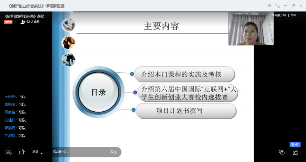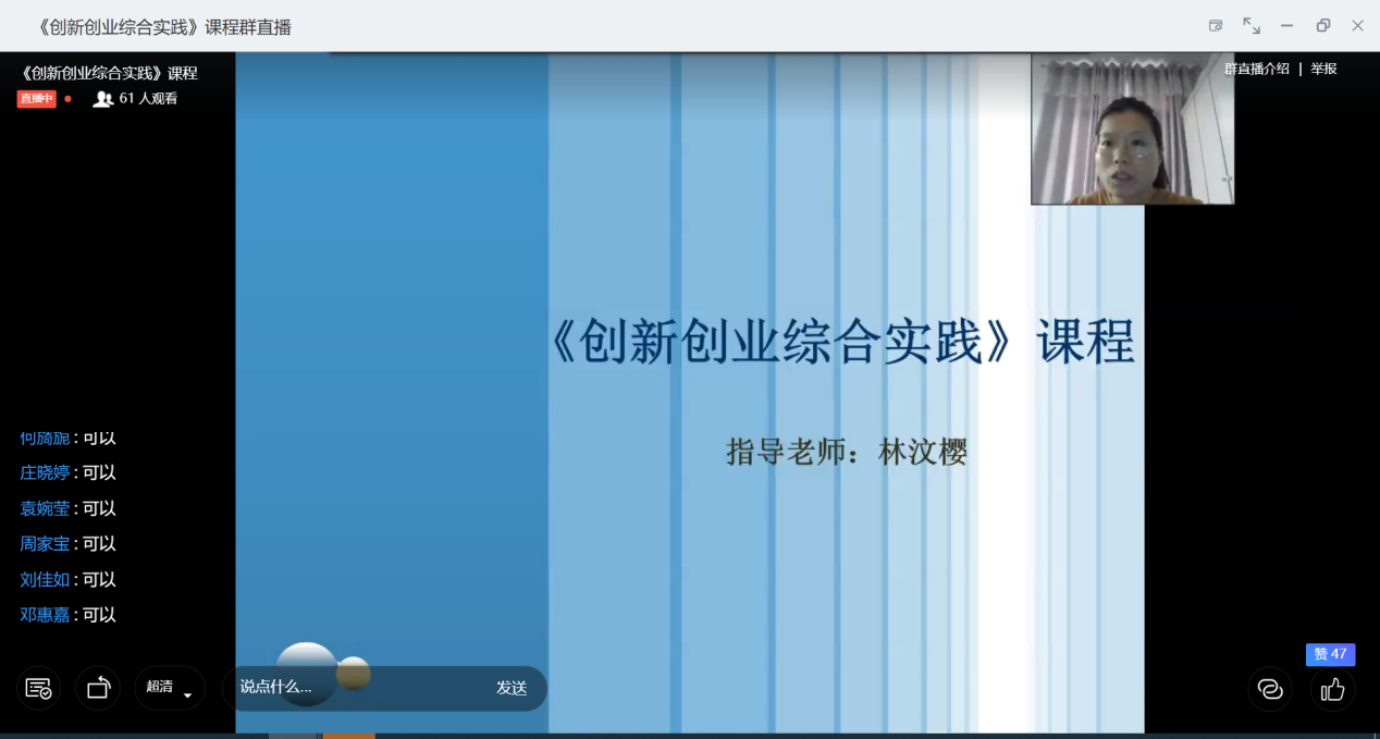 为了培养学生创新精神和创业能力,激发学生的创造力,提高学生的实践能力,学校在2019-2020学年第二学期开设了《创新创业综合实践》课程,此门课程的开课年级为2018级各专业。会计学院18级辅导员林汶樱老师利用“钉钉”平台于2020年5月22日、23日分别向会计学院18级各班学生讲解本门课程的主要内容。