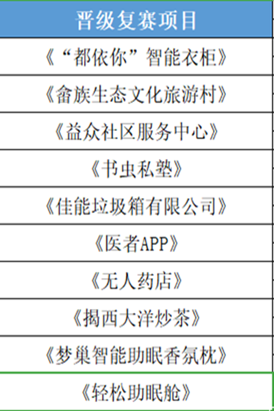 恭喜以上项目团队成功进入复赛。初赛的胜出,只是决赛的起点,希望同学们都能再接再励,勇往直前,以饱满的热情,最佳的精神状态迎战,争取更优异的成绩。预祝各团队在复赛中展现出最好的风采!