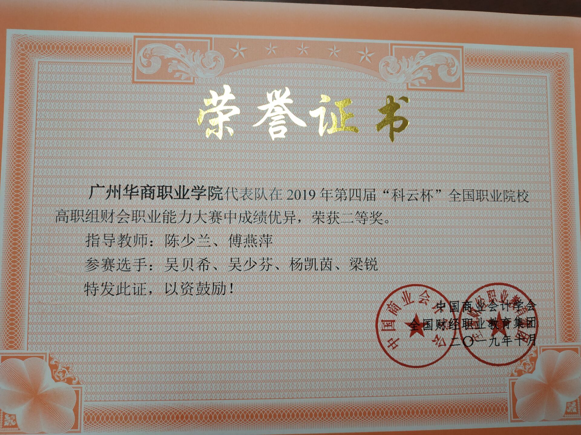 2019年9月26日,由中国商业会计学会主办、厦门科云信息科技有限公司承办的2019年“科云杯”全国职业院校财会职业能力大赛(高职组)全国网络选拔赛在各参赛校区本校举行,本次大赛共有来自全国31个省市的300多所院校,超5万名学生参与了本次大赛,我院会计学院陈少兰和傅燕萍两位老师带领的参赛队伍吴贝希、吴少芬、杨凯茵、梁锐四位同学通过紧张激烈的角逐荣获南部地区二等奖。