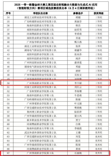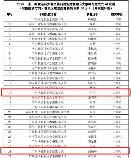 2025年6月4日,在第四届“一带一路暨金砖国家技能发展与技术创新大赛之业财税融合大数据与生成式AI应用(智能财税方向)高职组”区域赛中,数字财经学院胡顺华、石丽姚、刘兰、李宇媛四位教师组成的参赛团队凭借扎实的专业功底与创新能力,在激烈竞争中脱颖而出,斩获多项荣誉。其中,胡顺华、刘兰两位老师荣获区域赛二等奖,李宇媛老师获得三等奖,石丽姚老师荣获优秀奖,充分展现了我院在大数据财务与会计领域的师资实力与教学改革成果。
