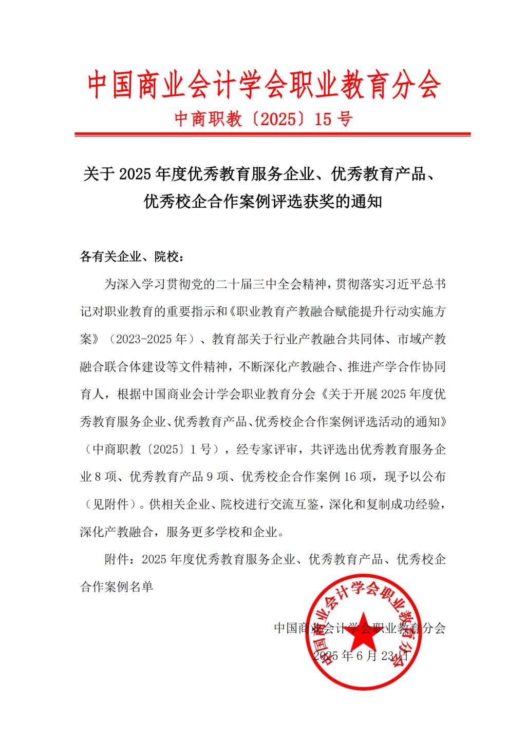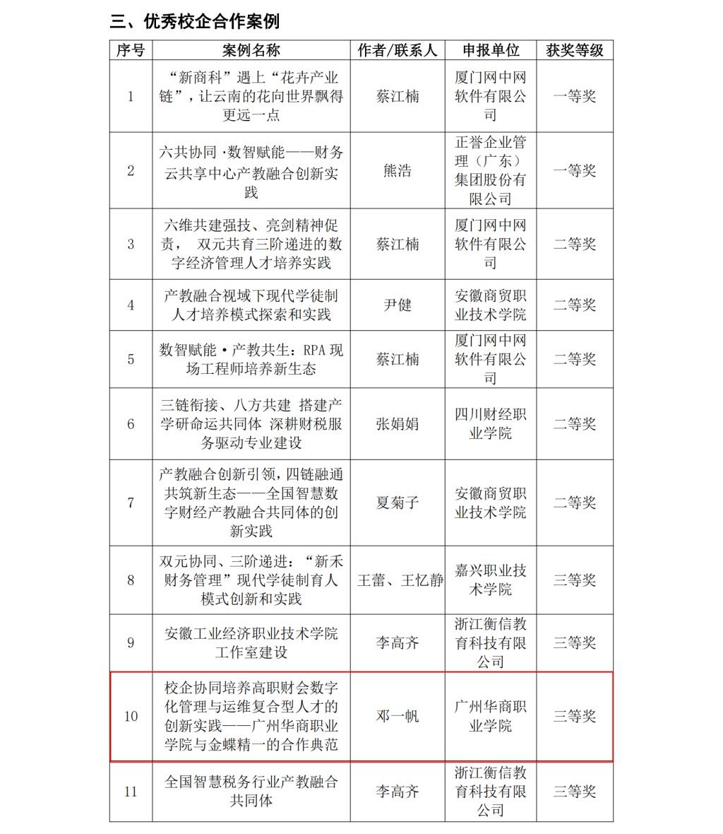 近日,中国商业会计学会职业教育分会公布了2025年度优秀教育服务企业、优秀教育产品、优秀校企合作案例评选结果,广州华商职业学院邓一帆老师申报的《校企协同培养高职财会数字化管理与运维复合型人才的创新实践——广州华商职业学院与金蝶精一的合作典范》案例荣获优秀校企合作案例三等奖,这标志着学校在深化产教融合、推进校企协同育人方面的探索与实践获得国家级行业协会的认可。
