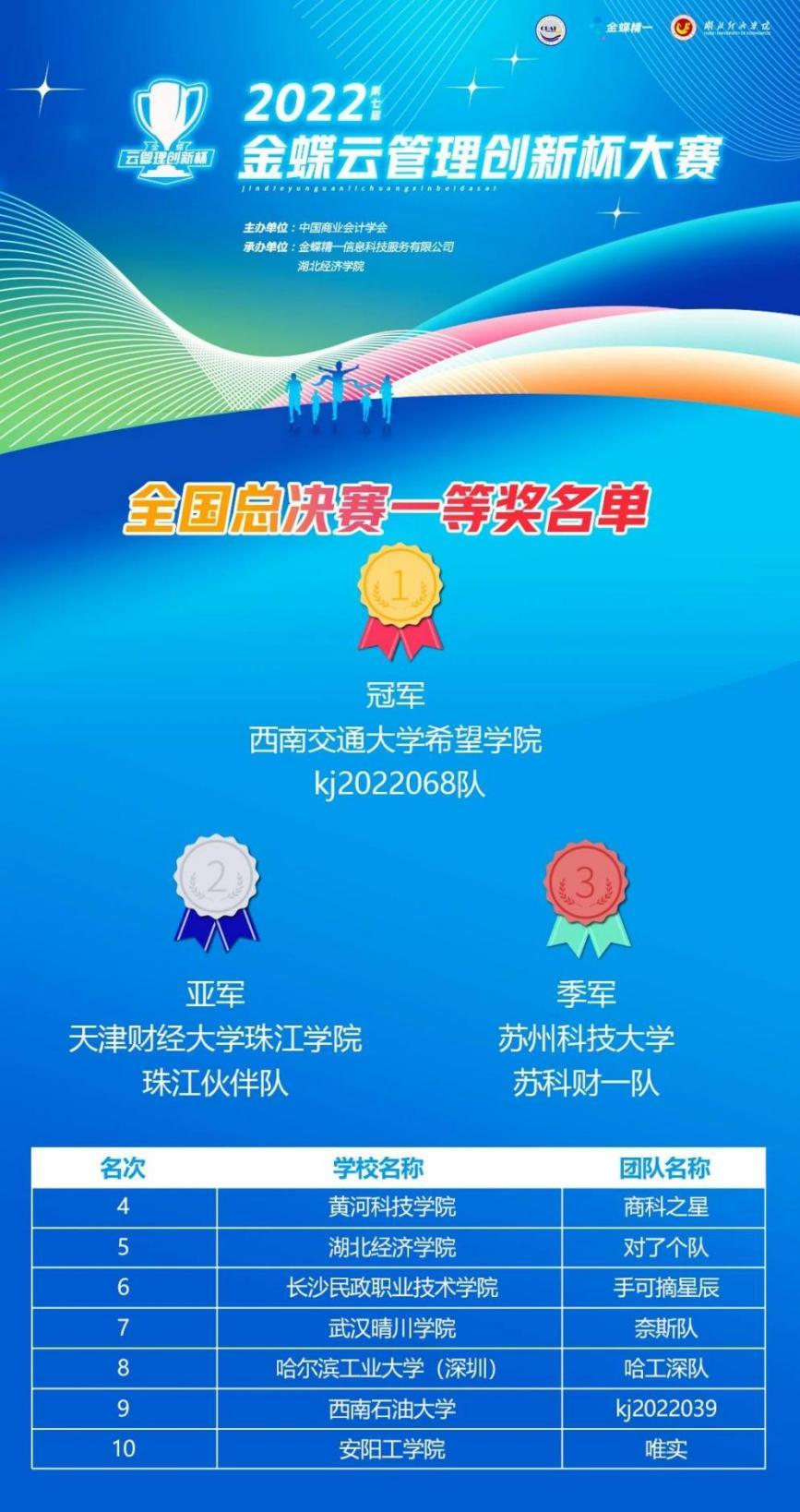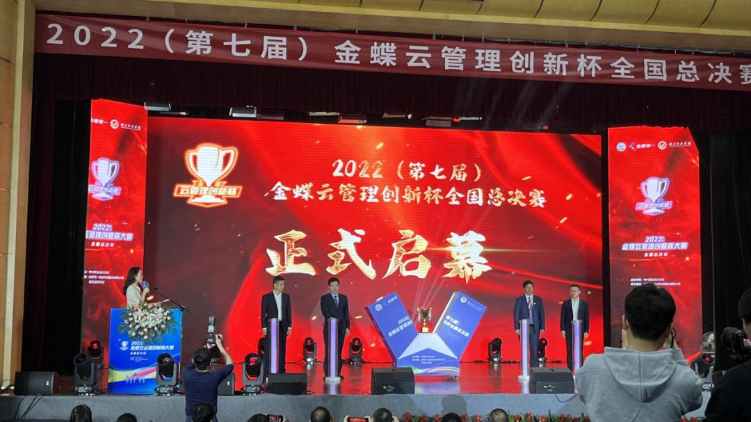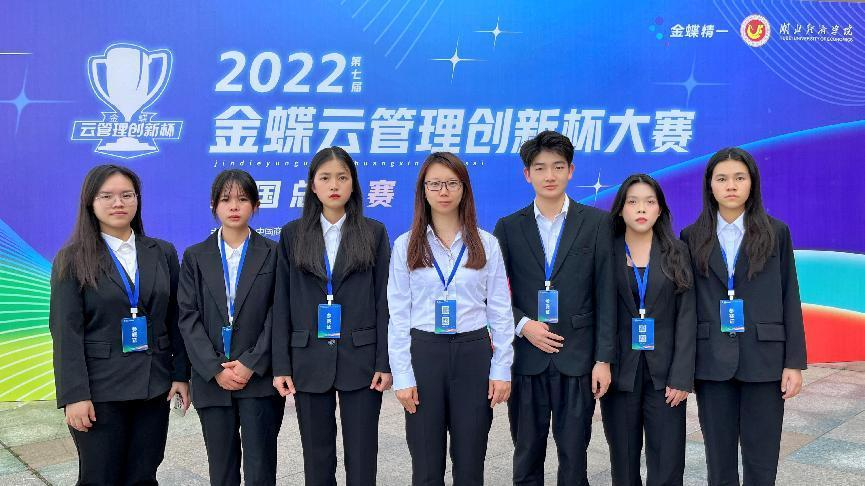 2022(第七届)金蝶云管理创新杯大赛全国总决赛在2023年4月16日在湖北经济学院举行,参赛院校达到380余所,超过13000名师生报名参赛,最终角逐出75支队伍到现场争夺桂冠,其中我校占两支队伍。