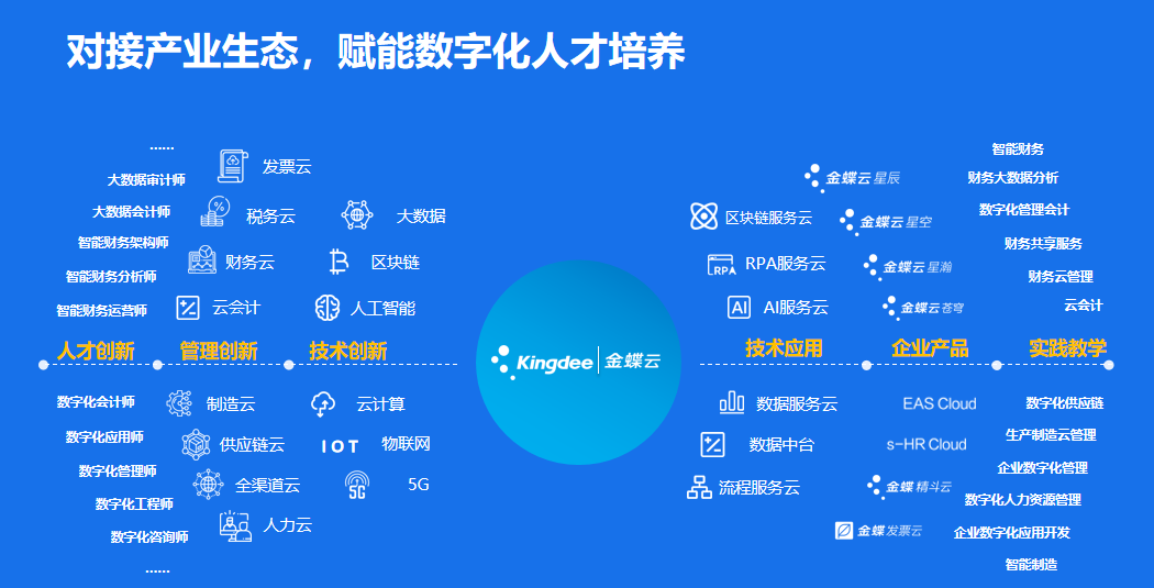 金蝶精一作为金蝶集团的子公司,以“成为最值得信赖的企业数字化人才培养与终身学习平台”为使命,致力于深入洞察企业数字化人才需求,服务于院校产教融合、专业从事于各层次企业数字化顾问的招聘培训与认证工作。在师资能力培养、课程开发、实习基地建设、就业培训等方面,已经与清华大学、合肥工业大学、上海立信会计金融学院等国内1300多所高校展开深度的校企合作。2019年成立了智能财务新人才校企联盟,与高校共同打造智能财务育人新生态、培养社会未来财务新人才。在智能财务、财务大数据、财务共享、集团管理会计、电商实训、云财务等教学方案的建设具有丰富的经验与基础。金蝶精一作为金蝶系企业数字化人才的培养与输送平台:为社会培养优秀企业数字化人才,助力金蝶生态企业数字化转型,让学生获得高质量的就业机会。