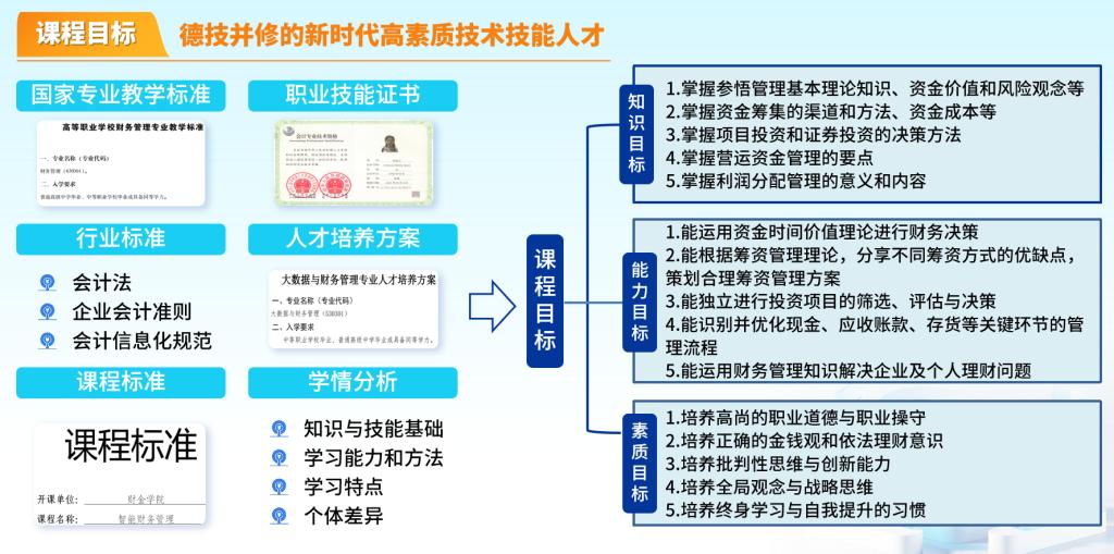 今日,我们共同启程,深入探索《智能财务管理》课程的全貌,从基本信息到课程设计、建设、实施,再到教学环境、效果评估及特色创新,全面剖析其精髓所在。一、 课程简介...