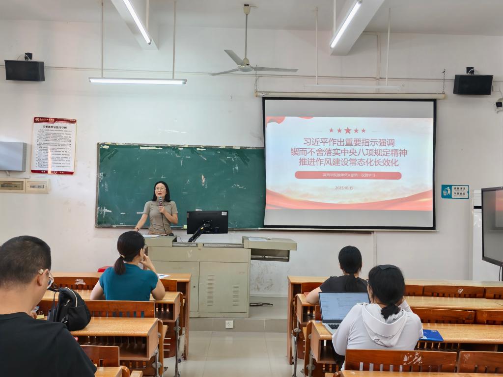 10月15日,数字商务学院教师党支部组织全体党员教师观看了习近平同志关于“锲而不舍落实中央八项规定精神,推进作风建设常态化长效化”的重要指示视频。此次专题学习...