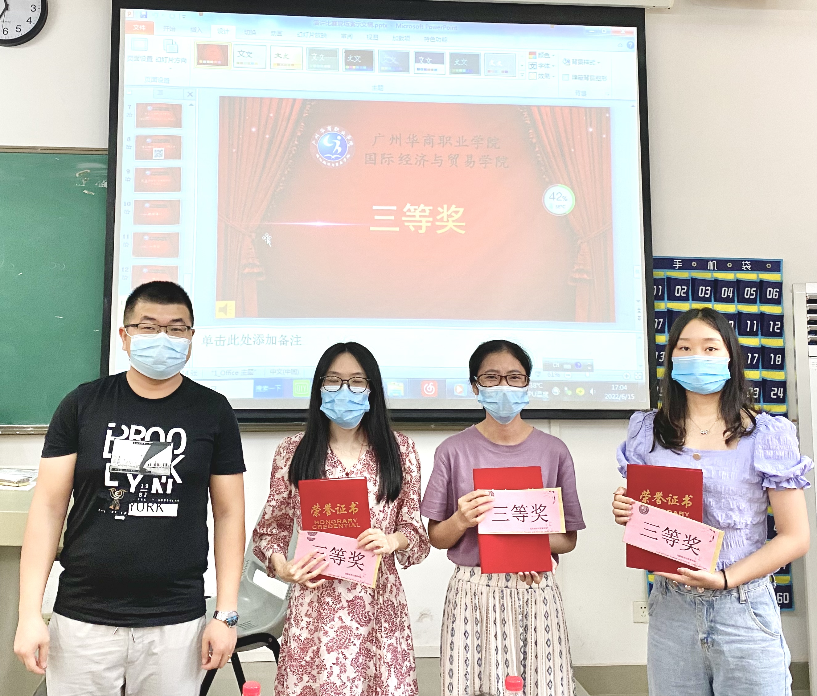激烈的竞争之后,国际商务教研室廖卓艺老师荣获一等奖;学工队伍甄伟杰老师荣获二等奖;大英教研室吴梓婷老师、商务英语教研室陆莹老师、电子商务教研室朱小兰老师荣获三等奖。