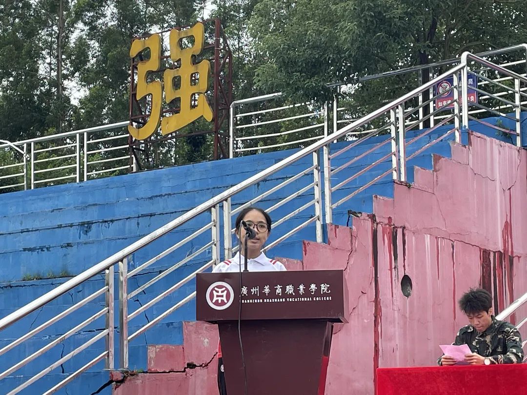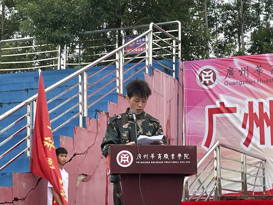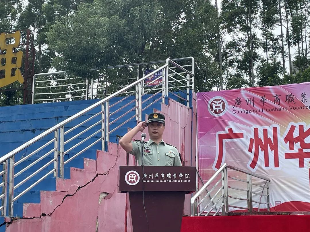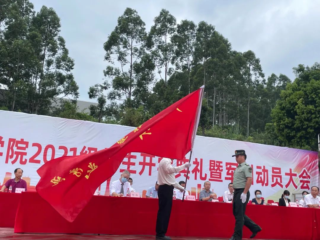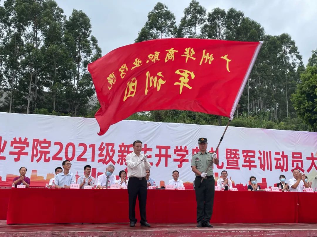 大会最后一项,校党委翁礼成书记向承训部队授军训团旗,广州华商职业学院2021级新生军训正式开始。