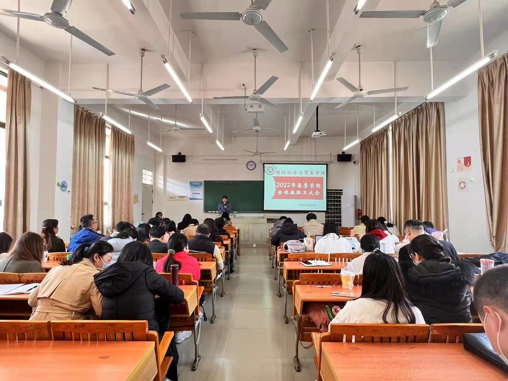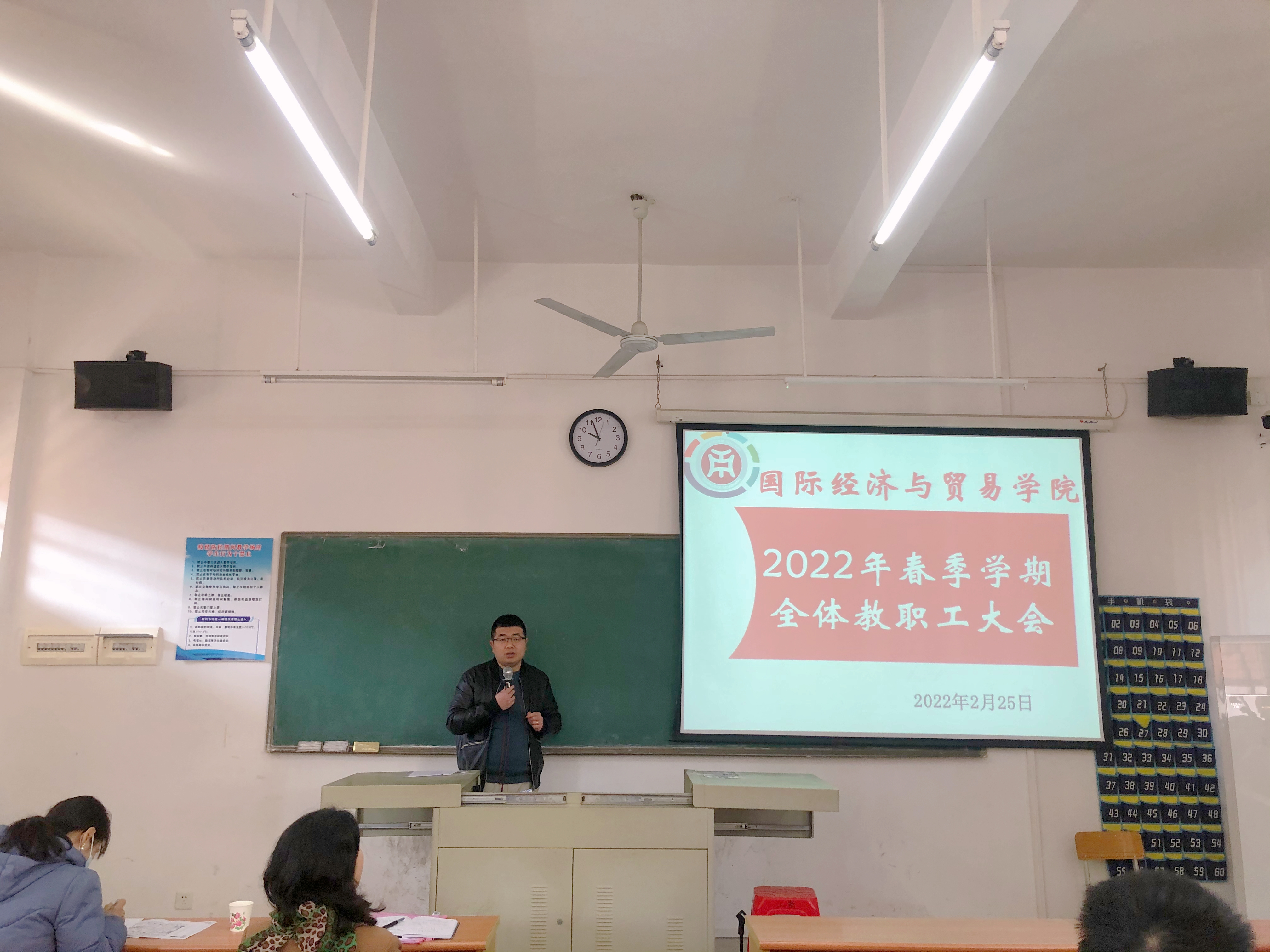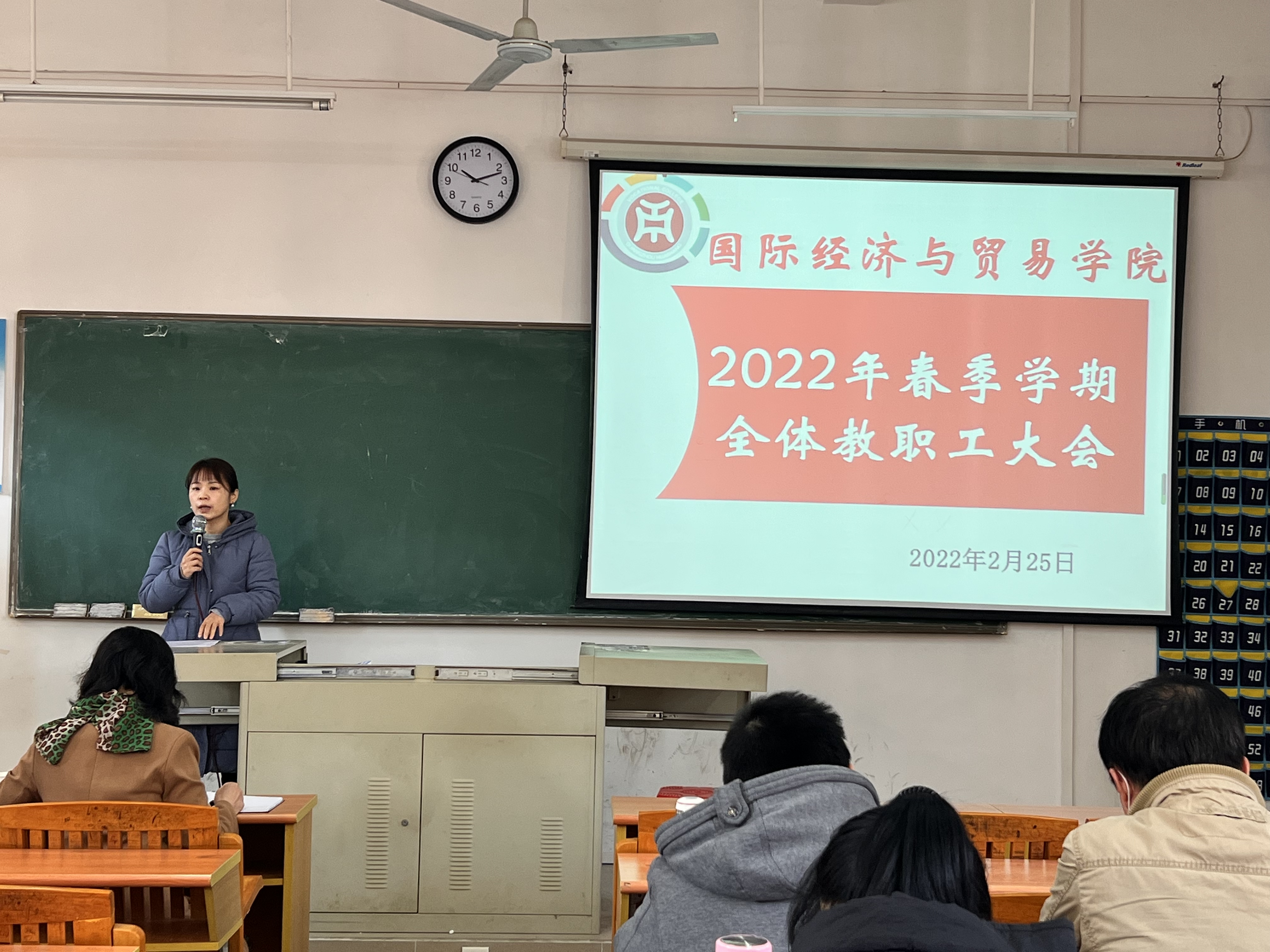 在喜迎新年,共踏新程之际,为确保2022年新学期工作有序、高效、高质推进,国际经济与贸易学院于25日上午9:00在博B406召开全体教职工大会,会议由梁悦院长主持,并由刘文平处长、吴仕坚党总支副书记、沙园松副院长、梁悦院长主讲,我院全体教职工参加了会议。