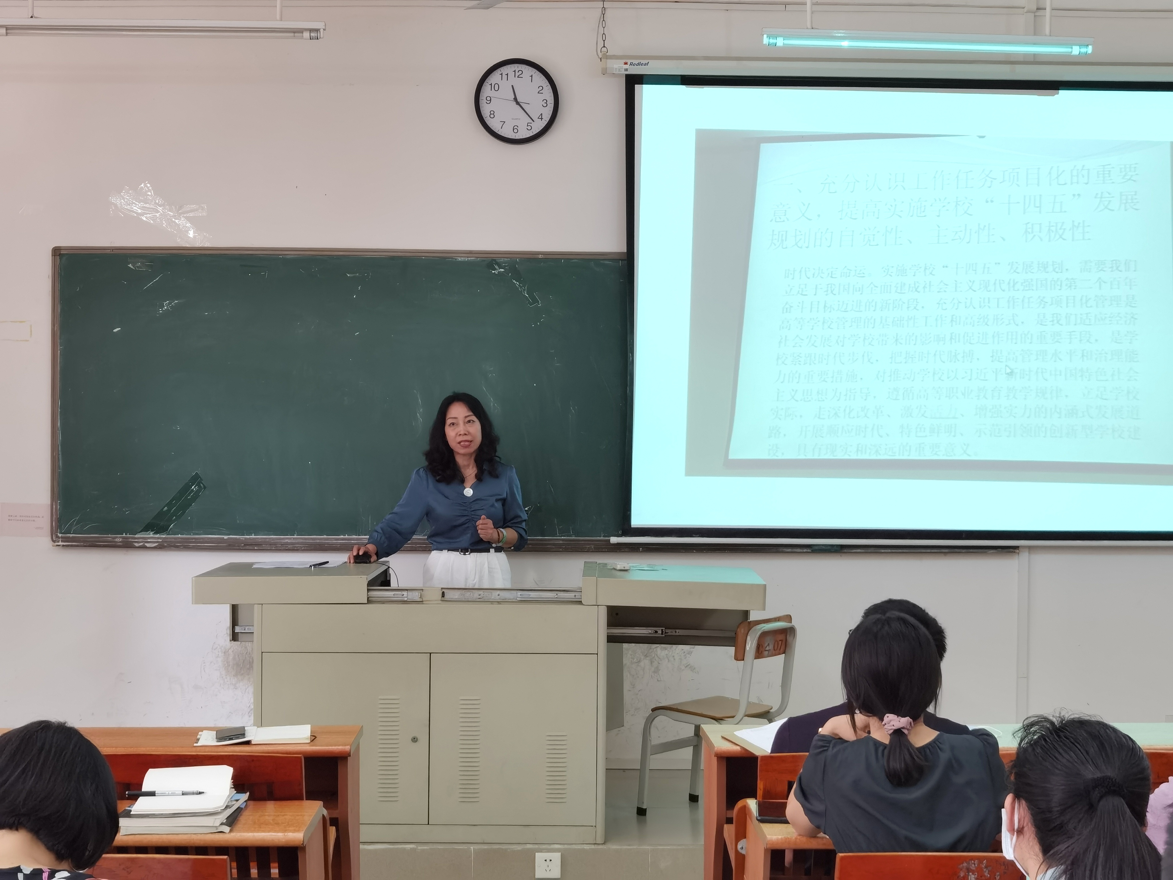 最后,梁悦院长分享了我校校长林琨智教授关于《大力推进工作任务项目化》会议的重要讲话精髓。明确为落实好学校“十四五”发展规划,要以“扩容、提质、强服务”为主线,大力推进工作任务项目化,走好第一步,迈出新成效。结合会议精神,院长对国贸学院今后的工作部署及精神做了更高的要求和展望,再次着重强调要重视国贸学院“一素质、两能力、三技术”的人才培养体系及“双师型”教师机制建设,为新学期的奋斗指明了方向。激励各教研室及老师们持续谋发展、强教研、重教学,促进学校可持续、高质量、高水平的健康发展。接着,为进一步明确细致工作安排,院长向全体教职工就《2021秋季学期重要工作推进明细》做了重要的解读和指示,并邀黄采芬教务员就教学工作安排进行了详细的讲解,为新学期各项工作的高效开展奠定了扎实的基础。