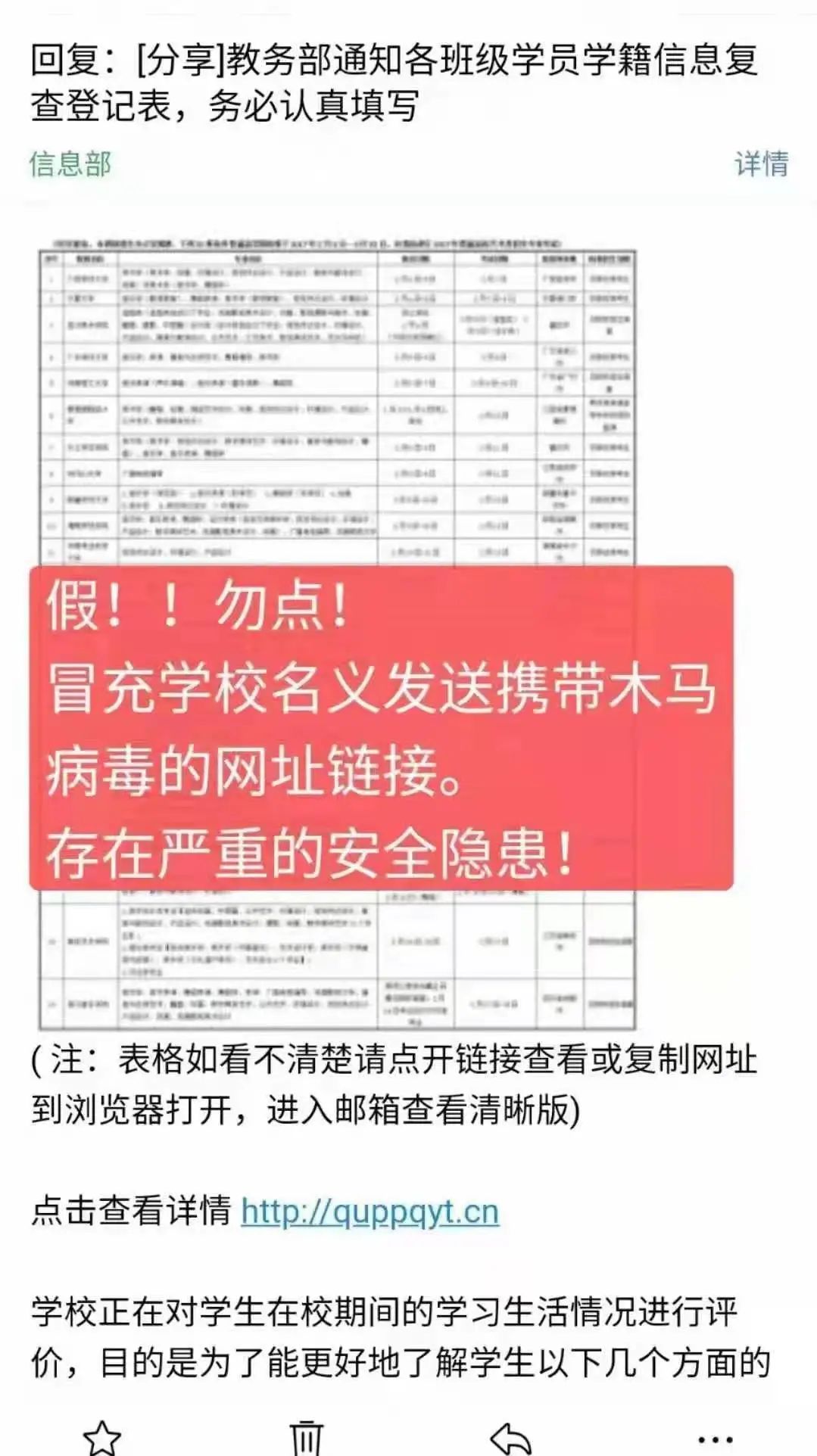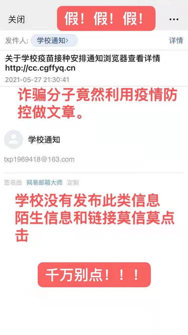 近期有学生收到相关邮件,请大家提高警惕,学校各部门不会直接给学生私发邮件,也不会私自拉同学入群。如果收到相关信息,请第一时间与辅导员联系确认,以防上当受骗。