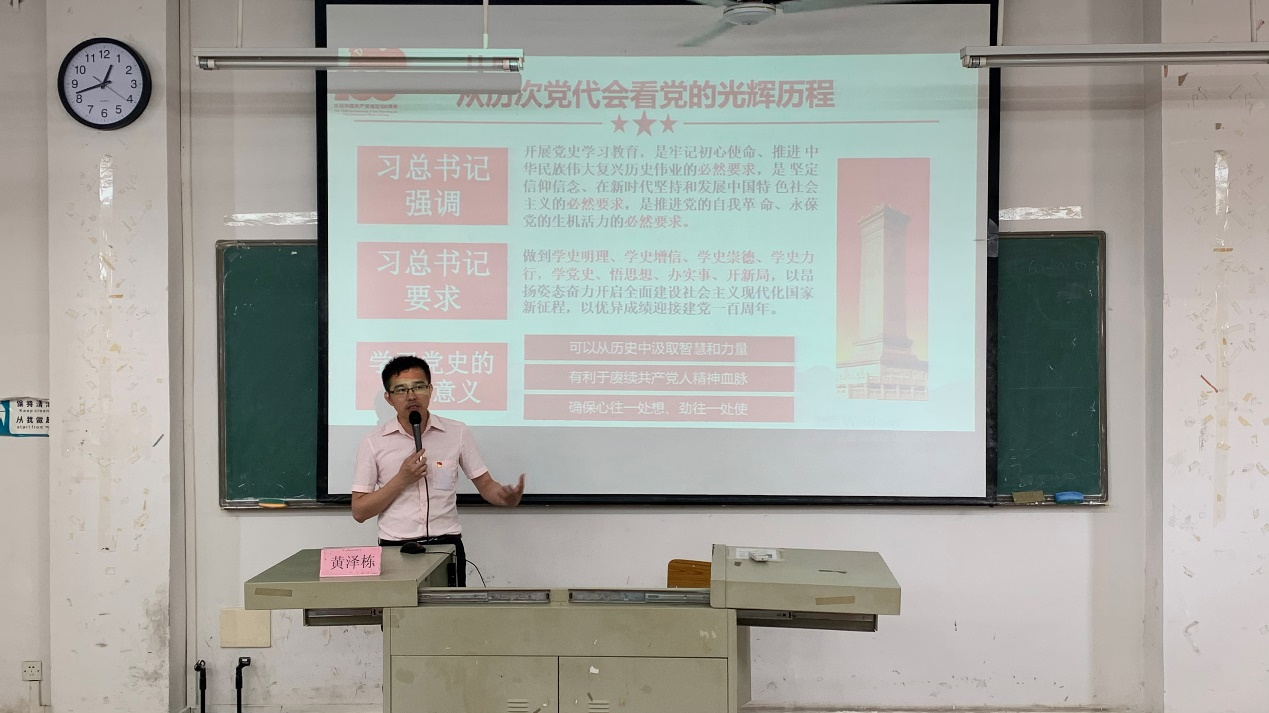 黄泽栋副书记讲解了习近平总书记在党史学习教育动员大会上强调的开展党史学习教育的三个“必然要求”的内容和“全党同志要做到学史明理、学史增信、学史崇德、学史力行,学党史、悟思想、办实事、开新局”的要求以及学习党史的现实意义。通过介绍历次中国共产党全国代表大会的时间、地点、参会人员、历史意义等,带领同学们一起回顾党的光辉历程。