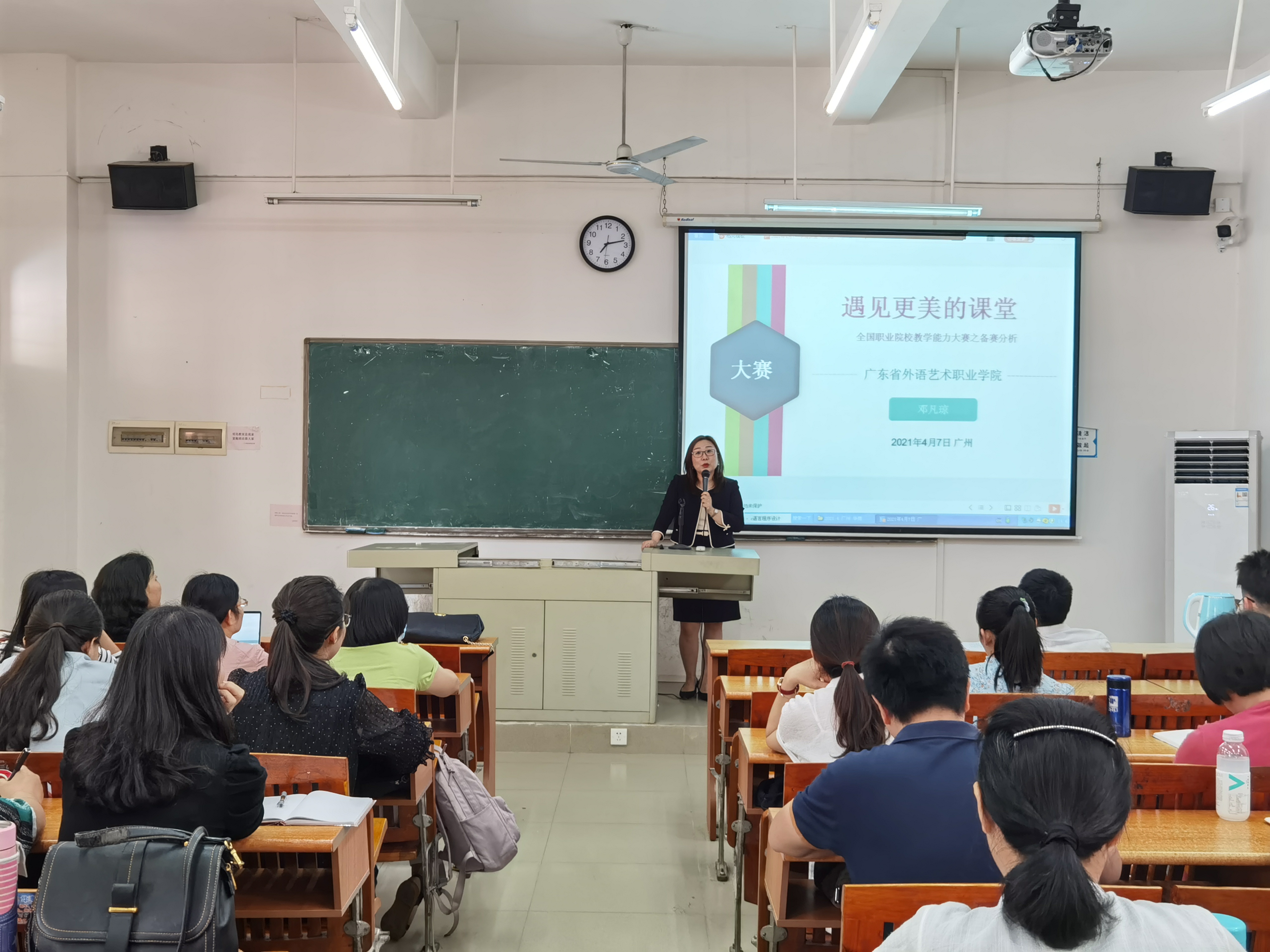 为提高我院教师教学能力,备战广东省教学能力大赛,4月7日下午,我院邀请全国职业院校信息化教学能力大赛一等奖获得者、广东省外语艺术职业学院课程教学改革与建设指导专家邓凡琼副教授来校作“遇见更美的课堂——全国职业院校教学与能力大赛之备赛分析”专题讲座。讲座由院长梁悦教授主持,我院全体教职工到场认真聆听了讲座。